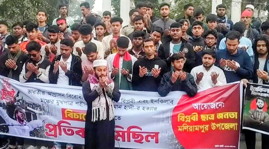 যশোরের মণিরামপুরে শহীদ হাদির হত্যার বিচারের দাবিতে উত্তাল হয়ে উঠেছে রাজপথ। শনিবার (২০ ডিসেম্বর) বিকেলে মণিরামপুর পৌরসভার সামনে শহীদ হাদির গায়েবানা জানাজা নামাজ এবং পরবর্তীতে একটি বিশাল প্রতিবাদ মিছিল ও সমাবেশ অনুষ্ঠিত হয়। শোক ও প্রতিবাদ সমাবেশ গায়েবানা জানাজা শেষে পৌরসভার সামনে এক সংক্ষিপ্ত সমাবেশ অনুষ্ঠিত হয়। সমাবেশে বক্তারা হাদি হত্যাকাণ্ডের তীব্র নিন্দা জানিয়ে এ ঘটনাকে 'পরিকল্পিত হত্যাকাণ্ড' বলে অভিহিত করেন। তারা বলেন, এ ধরনের নৃশংসতা সমাজে ভীতি সৃষ্টি করছে, যা জননিরাপত্তার জন্য চরম হুমকি। সমাবেশে বক্তব্য প্রদান করেন, শরীফ মাহমুদ ও অভি হাসান, ইব্রাহিম হোসেন ও এস এম তাজামুল। কামরুল ইসলাম, রিয়াদ, ফয়সাল হোসেন, সানি ও সাদি। বক্তাদের প্রধান দাবি বক্তারা প্রশাসনের কাছে তিনটি প্রধান দাবি তুলে ধরেন সেগুলো হলো, ১'হত্যাকাণ্ডের নিরপেক্ষ ও সুষ্ঠু তদন্ত নিশ্চিত করা। ২'দোষীদের দ্রুত সময়ের মধ্যে গ্রেপ্তার করা। ৩'আদালতের মাধ্যমে অপরাধীদের দৃষ্টান্তমূলক শাস্তির ব্যবস্থা করা। বিক্ষোভ মিছিল ও সংহতি সমাবেশ শেষে একটি প্রতিবাদ মিছিল বের করা হয়। মিছিলটি মণিরামপুর পৌর বাজারের প্রধান প্রধান সড়ক প্রদক্ষিণ করে পুনরায় পৌরসভার সামনে এসে শেষ হয়। এতে উপজেলার বিভিন্ন শিক্ষা প্রতিষ্ঠানের শিক্ষার্থী ও সাধারণ জনতা স্বতঃস্ফূর্তভাবে অংশ নেন। কর্মসূচিতে স্থানীয় রাজনৈতিক ব্যক্তিবর্গ, গণমাধ্যমকর্মী এবং সাধারণ পথচারীরা উপস্থিত হয়ে শহীদ হাদির পরিবারের প্রতি সমবেদনা ও আন্দোলনের সাথে সংহতি প্রকাশ করেন।