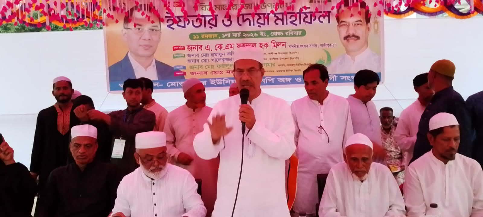 গাজীপুর-৫ আসনের সংসদ সদস্য আলহাজ্ব একেএম ফজলুল হক মিলন বলেছেন, শান্তি ও নিরাপদে থাকার জন্য জনগণ বিএনপিকে ভোট দিয়েছেন। জনগনের শান্তি বিনষ্ট হয় এমন কোনো কাজ করা যাবে না। আমরা জনগণকে প্রতিশ্রুতি দিয়েছি সুখে-দুঃখে তাদের পাশে থাকবো। কোনো ধরনের চাঁদাবাজি, জমি দখল, সন্ত্রাসী কর্মকাণ্ড, প্রভাব খাটিয়ে বিচার সালিশ করা থেকে নেতাকর্মীদের বিরত থাকতে হবে। মনে রাখতে হবে জনগনের নিরাপত্তার দায়িত্ব আমাদের। দলের কেউ অপকর্ম করলে তাদের কোনো ধরনের ছাড় দেয়া হবে না। রোববার বিকেলে কালীগঞ্জ উপজেলার মোক্তারপুর ইউনিয়ন বিএনপি,অঙ্গ ও সহযোগী সংগঠনের আয়োজনে বীর মুক্তিযোদ্ধা রুহুল আমিন ঢালী হাইস্কুল এন্ড কলেজ মাঠে ইফতার ও দোয়া মাহফিল অনুষ্ঠানে প্রধান অতিথির বক্তৃতায় এমপি ফজলুল হক মিলন এসব কথা বলেন। অনুষ্ঠানে বিশেষ অতিথি হিসেবে উপস্থিত ছিলেন কালীগঞ্জ উপজেলা বিএনপির আহবায়ক হুমায়ুন কবির মাষ্টার, সদস্য সচিব খালেকুজ্জামান বাবলু। মোক্তারপুর ইউনিয়ন বিএনপির সিনিয়র সহ-সভাপতি এবাদুল্লাহ শেখ দুলালের সভাপতিত্বে অনুষ্ঠানটি পরিচালনা করেন ইউনিয়ন বিএনপির সাধারন সম্পাদক মো.মজনু শেখ। এই সময় উপস্থিত ছিলেন উপজেলা বিএনপির সাবেক সাংগঠনিক সম্পাদক মনিরুজ্জান খান লাভলু, মোক্তারপুর ইউনিয়ন বিএনপির সাংগঠনিক সম্পাদক মুনসুর আহমেদ, উপজেলা জাসাসের প্রতিষ্ঠাতা সভাপতি আরিফ আমান খান, উপজেলা যুবদলের আহবায়ক আলী নুর হাসান, উপজেলা জাসাসের সদস্য সচিব শাহাদাত হোসেন মিঠুসহ দলীয় অঙ্গ সহযোগী সংগঠনের নেতাকর্মী ও সুধী সমাজ এবং সাধারন জনগন।